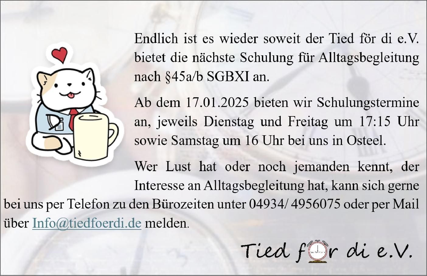 Gegründet wurde der Tied för di e.V. im Februar 2019. Seit 2020 sind wir im Raum Ostfriesland tätig. Unser Verein ist anerkannter Leistungserbringer für Alltagsbegleitung - niederschwelligen Betreuung nach §45a SGB XI - für hilfe und pflegebedürftige Menschen. Unsere Leistungen werden durch geschulte ehrenamtliche Helferinnen und Helfer erbracht. Der oder die Ehrenamtliche erhält für die Mitarbeit eine